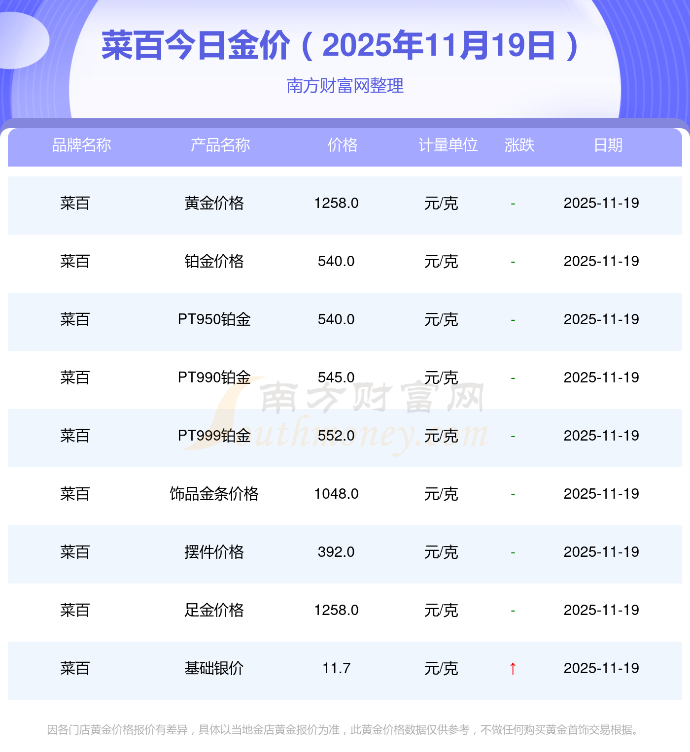 2025年11月19日菜百最新价格:黄金价格1295.0元/克,铂金价格619.0元/克,饰品金价(内地)1295.0元/克,黄金饰品(香港)45120.0,铂金价格(香港)17690.0,金条价格(香港)40700.0,金条金价(内地)1133.0元/克,黄金价格1291.0元/克,铂金价格600.0元/克,足金价格1291.0元/克,黄金价格1263.0元/克。