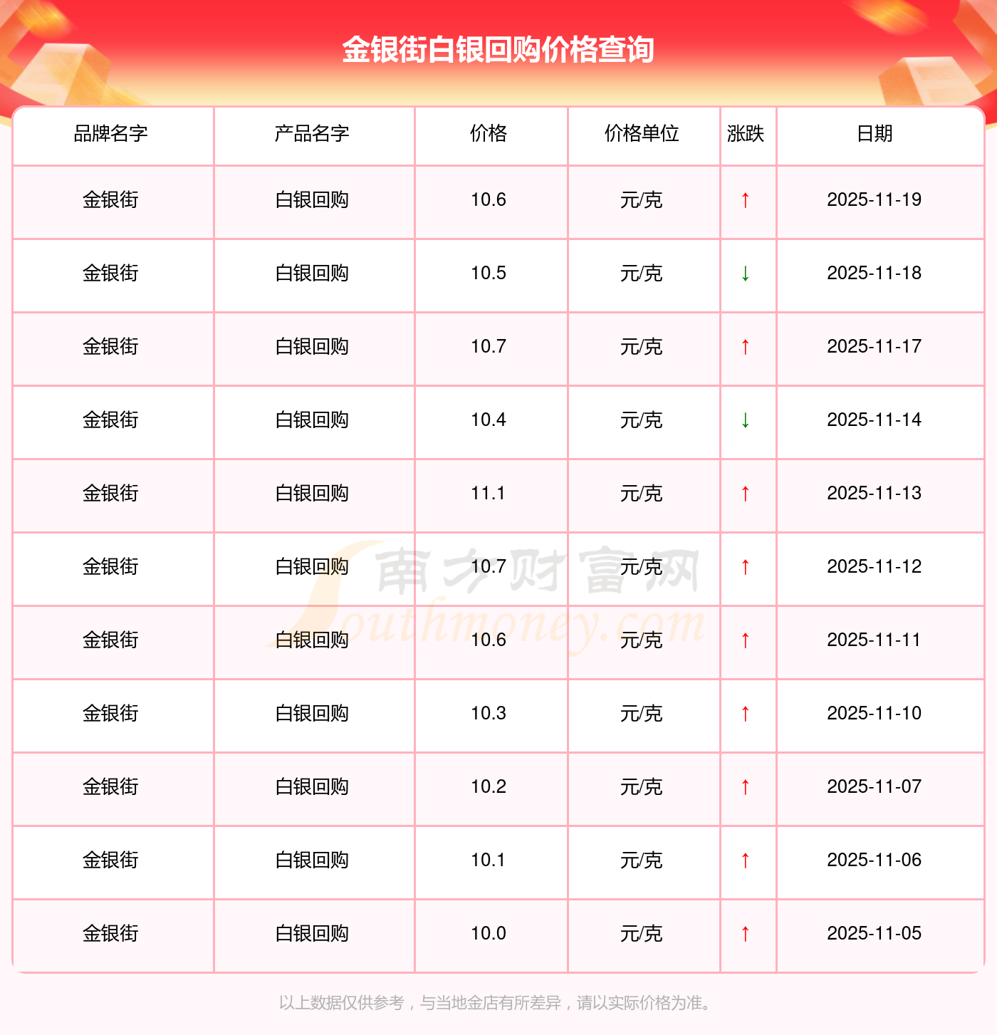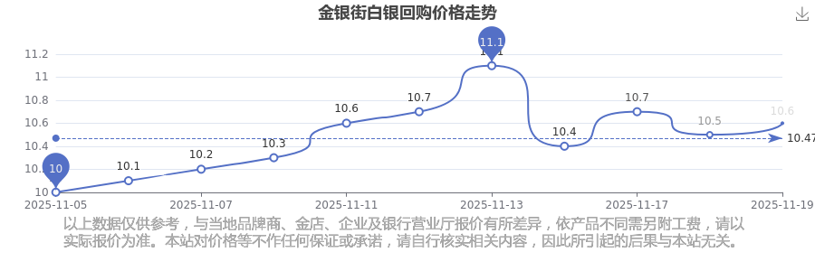 2025年11月19日金银街白银回购价格最新是10.6元/克。