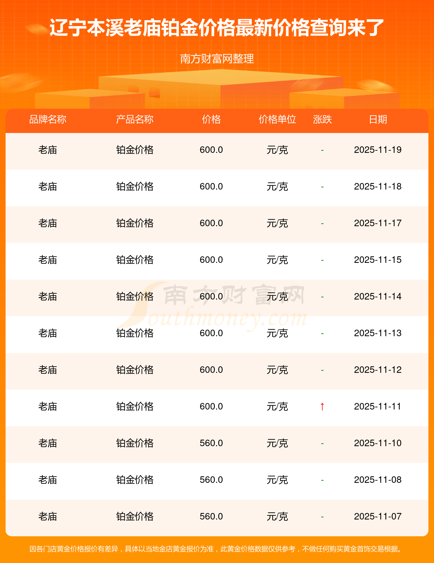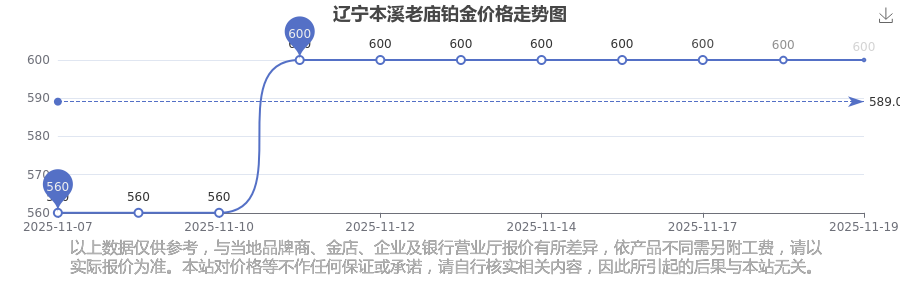 今日(2025年11月19日),辽宁本溪老庙铂金价格的定价为 600.0元/克。