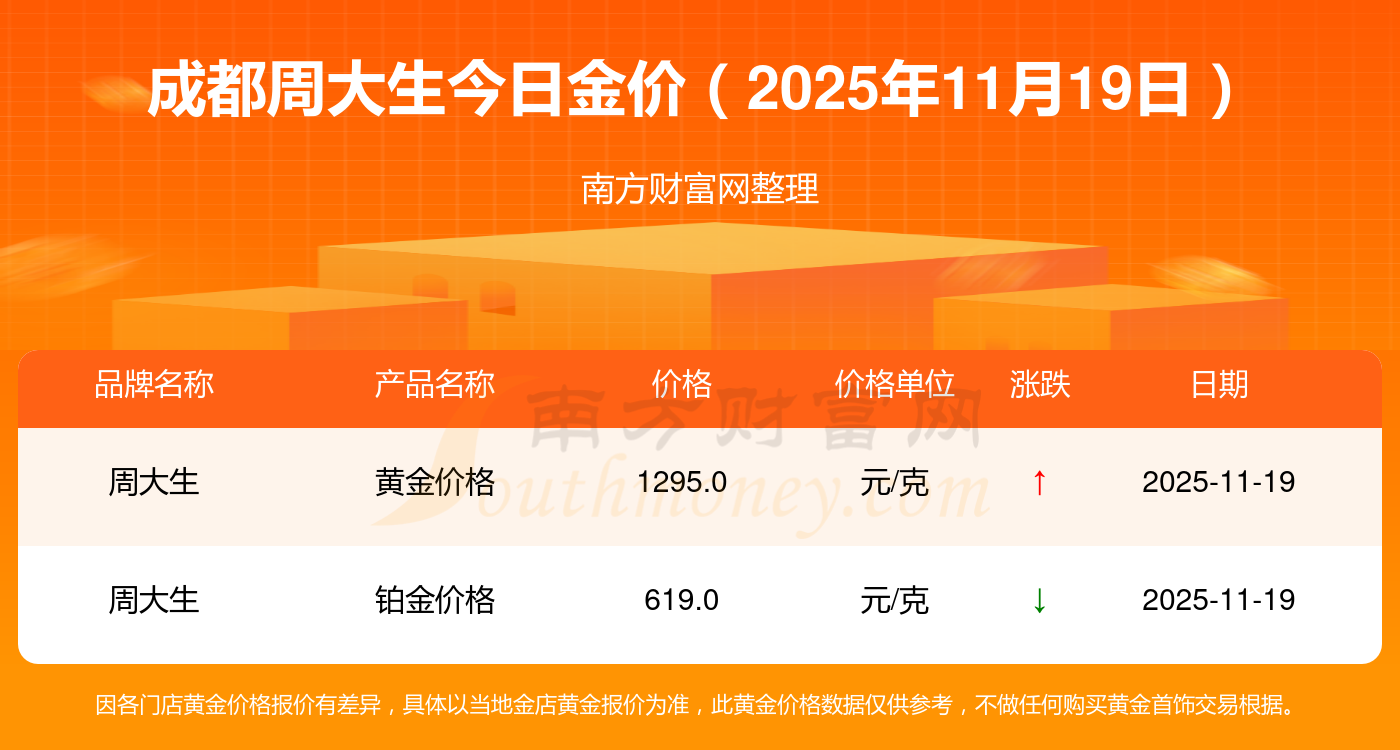 2025年11月19日成都周大生黄金按克计价,现在多少钱一克?黄金价格1295.0元/克,铂金价格619.0元/克,饰品金价(内地)1295.0元/克,黄金饰品(香港)45120.0,铂金价格(香港)17690.0,金条价格(香港)40700.0,金条金价(内地)1133.0元/克,黄金价格1291.0元/克,铂金价格600.0元/克,足金价格1291.0元/克,黄金价格1263.0元/克。