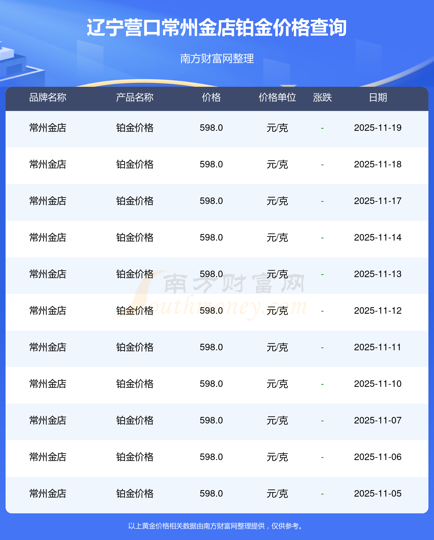 今天是2025年11月19日,周大福、周大福、周大福、周大福、周大福、周大福、周大福、老凤祥、老凤祥、老凤祥、周六福等各大金店品牌铂金价格最新价格如下:周大福1295.0元/克、周大福619.0元/克、周大福1295.0元/克、周大福45120.0、周大福17690.0、周大福40700.0、周大福1133.0元/克、老凤祥1291.0元/克、老凤祥600.0元/克、老凤祥1291.0元/克、周六福1263.0元/克。