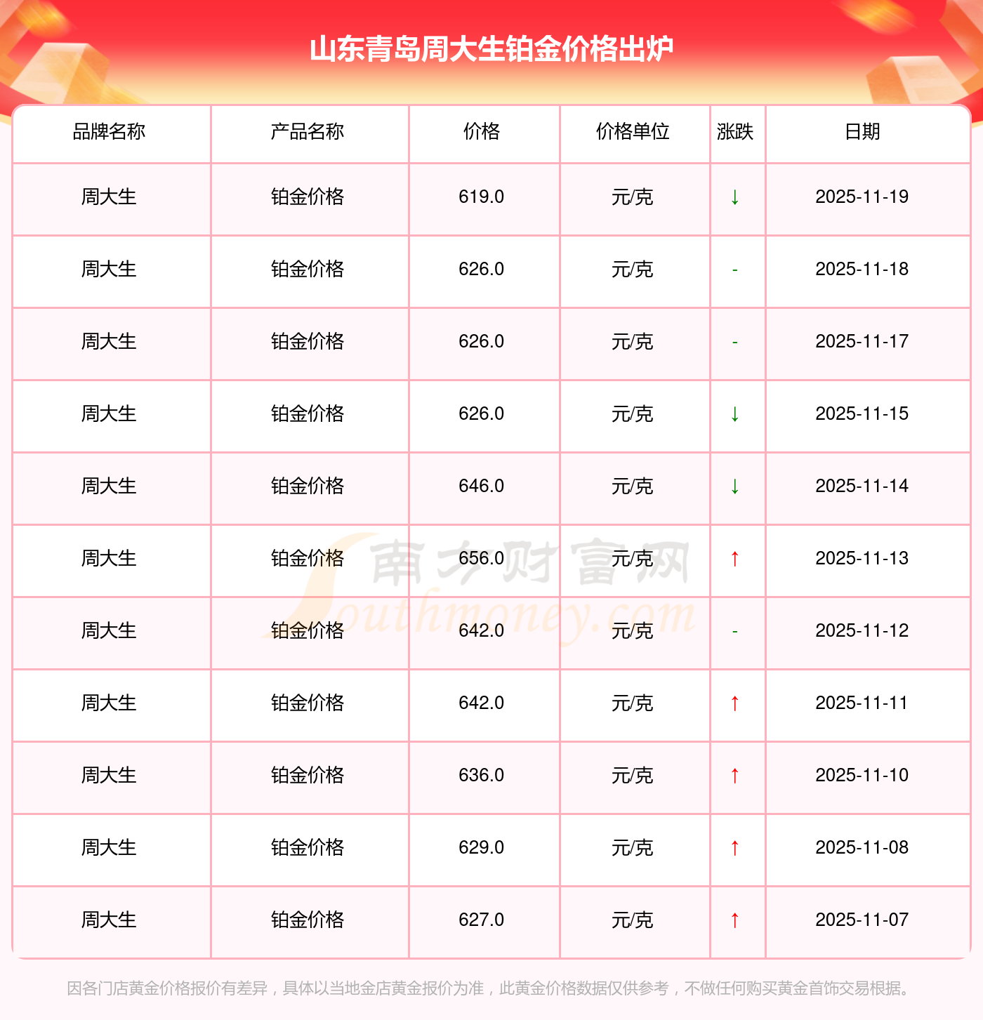 今日(2025年11月19日)山东青岛周大生铂金价格:619.0元/克。