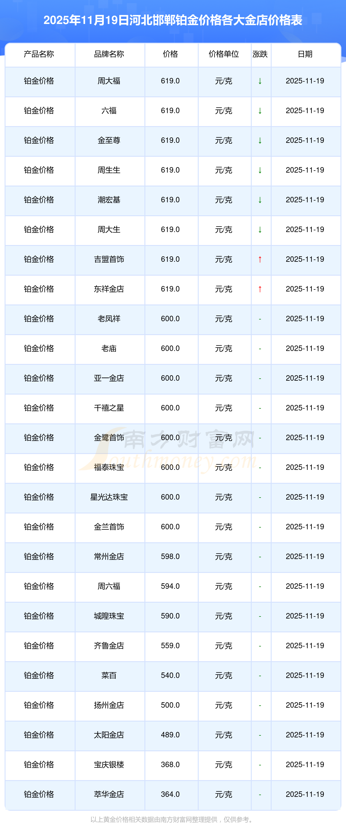 目前,河北邯郸铂金价格报价区间在619.0元/克和364.0元/克之间。最高的为周大福,报价619.0元/克,最低的为萃华金店,报价364.0元/克。今日铂金价格高低差为255元/克。
