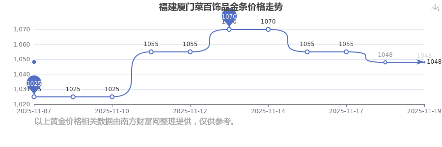 2025年11月19日,福建厦门菜百饰品金条价格每克的价值量定格在1048.0元/克。