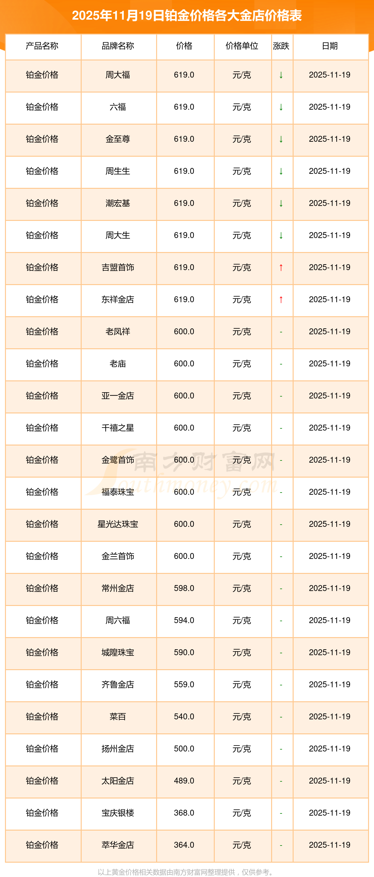 2025年11月19日,周大福、周大福、周大福、周大福、周大福、周大福、周大福、老凤祥、老凤祥、老凤祥、周六福等各大金店品牌铂金价格今日价格如下:周大福1295.0元/克、周大福619.0元/克、周大福1295.0元/克、周大福45120.0、周大福17690.0、周大福40700.0、周大福1133.0元/克、老凤祥1291.0元/克、老凤祥600.0元/克、老凤祥1291.0元/克、周六福1263.0元/克。