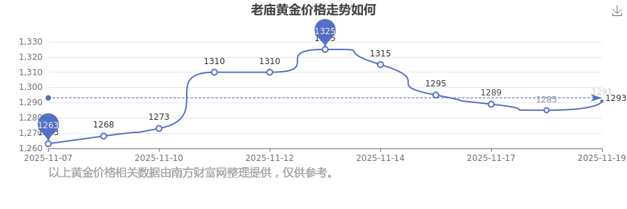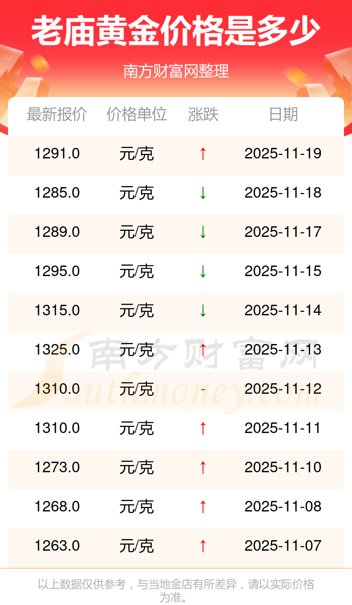 今日黄金价格查询_现在金价黄金一克多少钱,黄金价格是多少钱一克?黄金是优良的导电导热材料,具备良好的导热特性。因其化学稳定性高、抗氧化性强,可用来制作高精度电子元件,所以在电子工业的特殊电路设计中经常被使用。老庙今日黄金价格的最新标价为1291.0元/克。