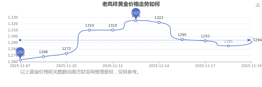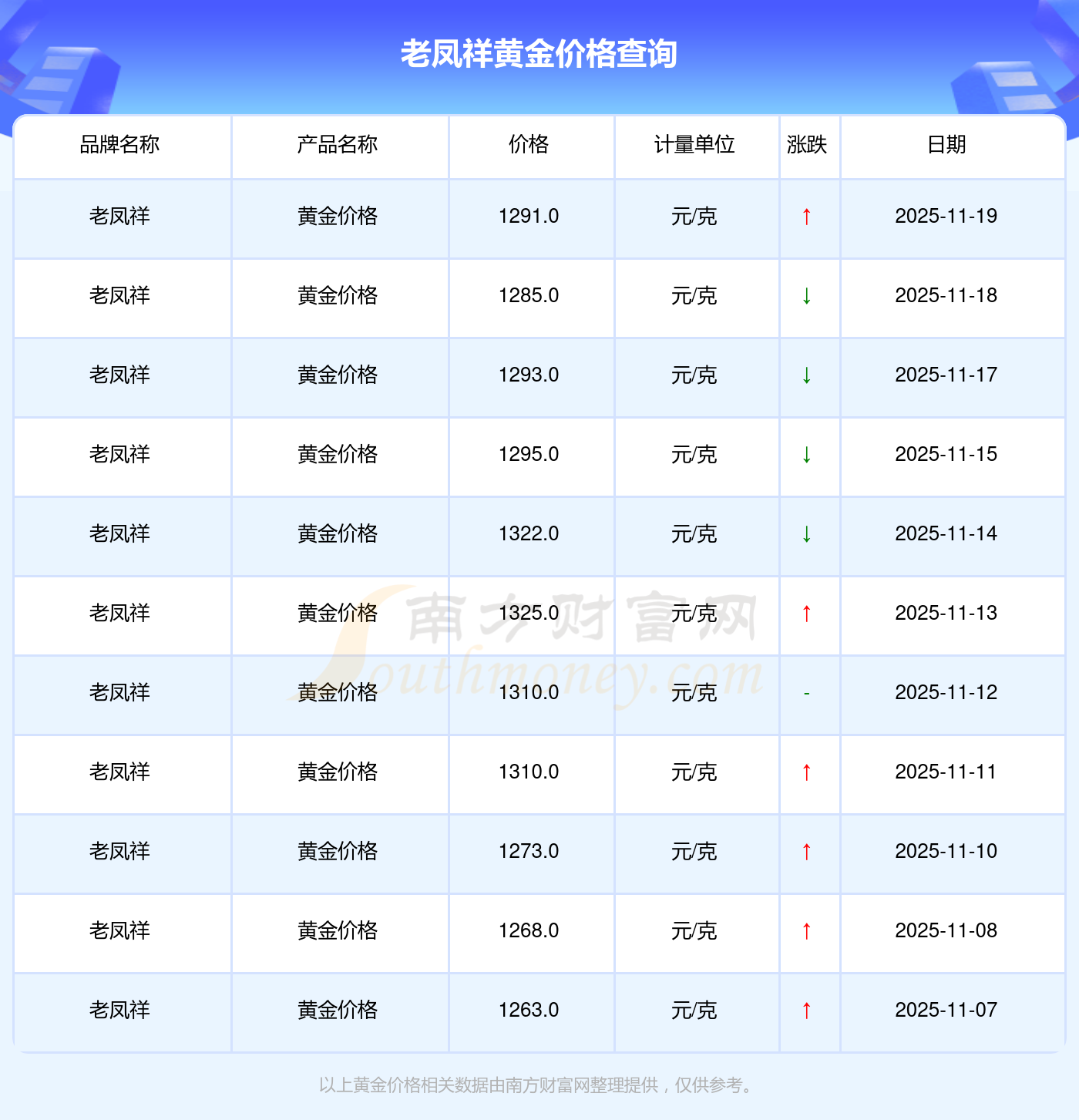 2025年11月19日老凤祥黄金价格:1291.0元/克。