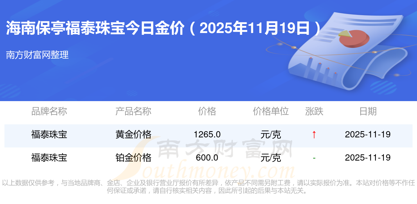 2025年11月19日海南保亭福泰珠宝一克黄金对应的价格是多少?黄金价格1295.0元/克,铂金价格619.0元/克,饰品金价(内地)1295.0元/克,黄金饰品(香港)45120.0,铂金价格(香港)17690.0,金条价格(香港)40700.0,金条金价(内地)1133.0元/克,黄金价格1291.0元/克,铂金价格600.0元/克,足金价格1291.0元/克,黄金价格1263.0元/克。