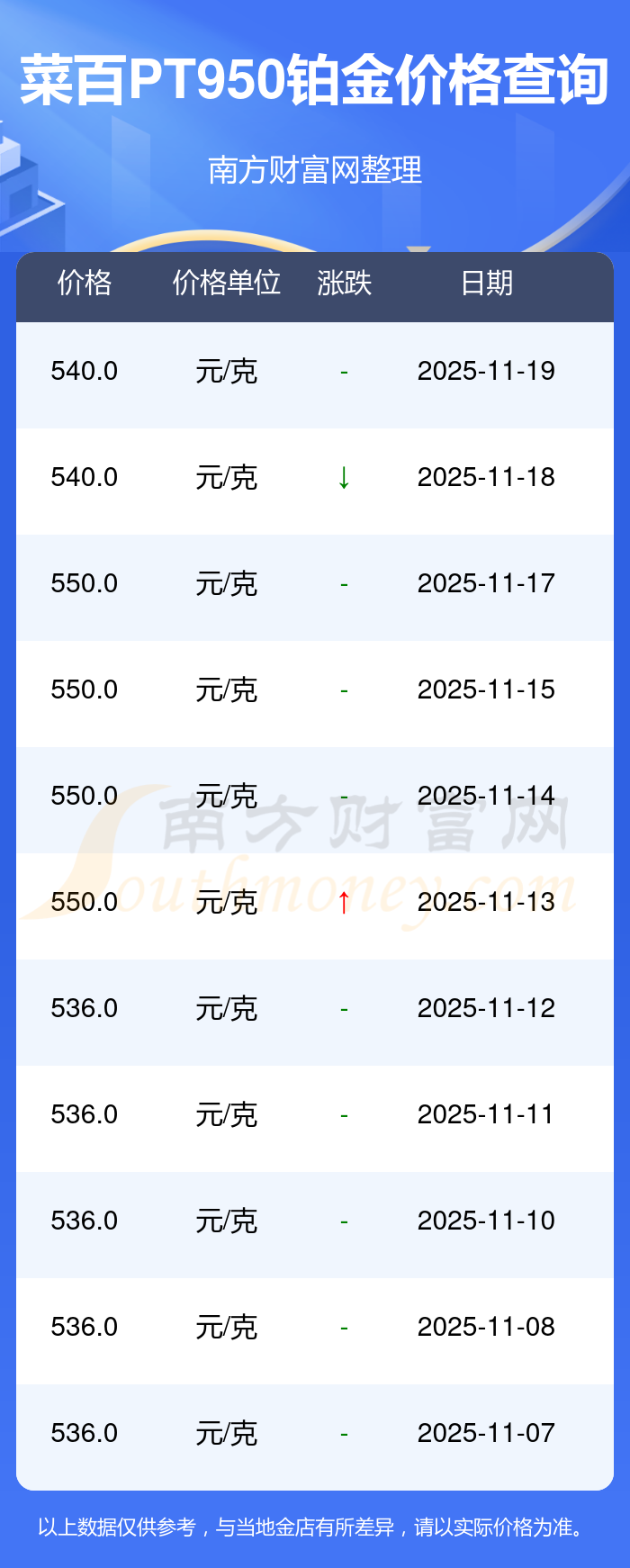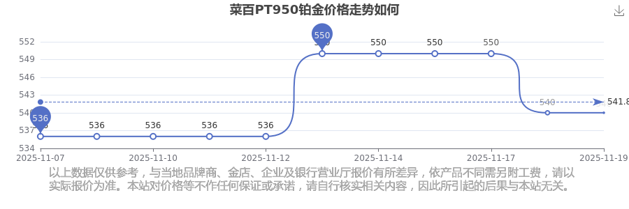 2025年11月19日菜百PT950铂金价格最新为540.0元/克。
