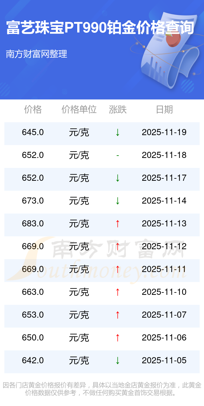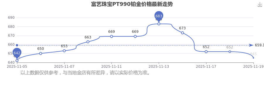 富艺珠宝 PT990铂金在今日的最新价格显示为645.0元/克。