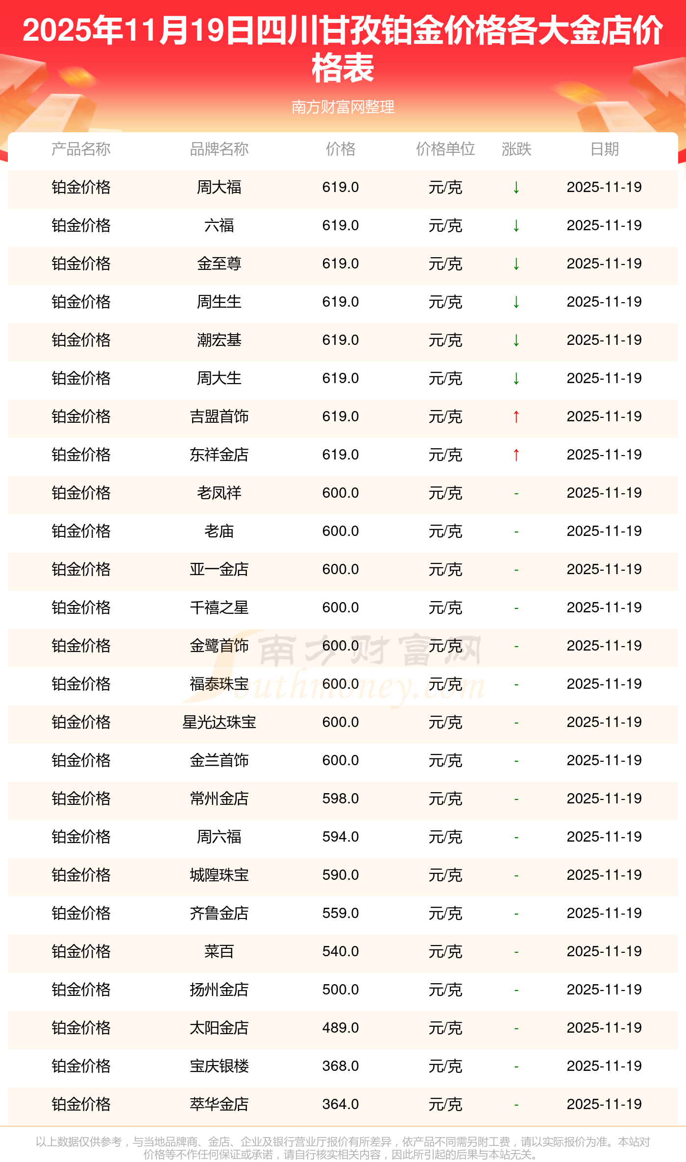 今天是2025年11月19日,四川甘孜周大福、周大福、周大福、周大福、周大福、周大福、周大福、老凤祥、老凤祥、老凤祥、周六福等各大金店品牌铂金价格最新价格行情是这样的:周大福1295.0元/克、周大福619.0元/克、周大福1295.0元/克、周大福45120.0、周大福17690.0、周大福40700.0、周大福1133.0元/克、老凤祥1291.0元/克、老凤祥600.0元/克、老凤祥1291.0元/克、周六福1263.0元/克。