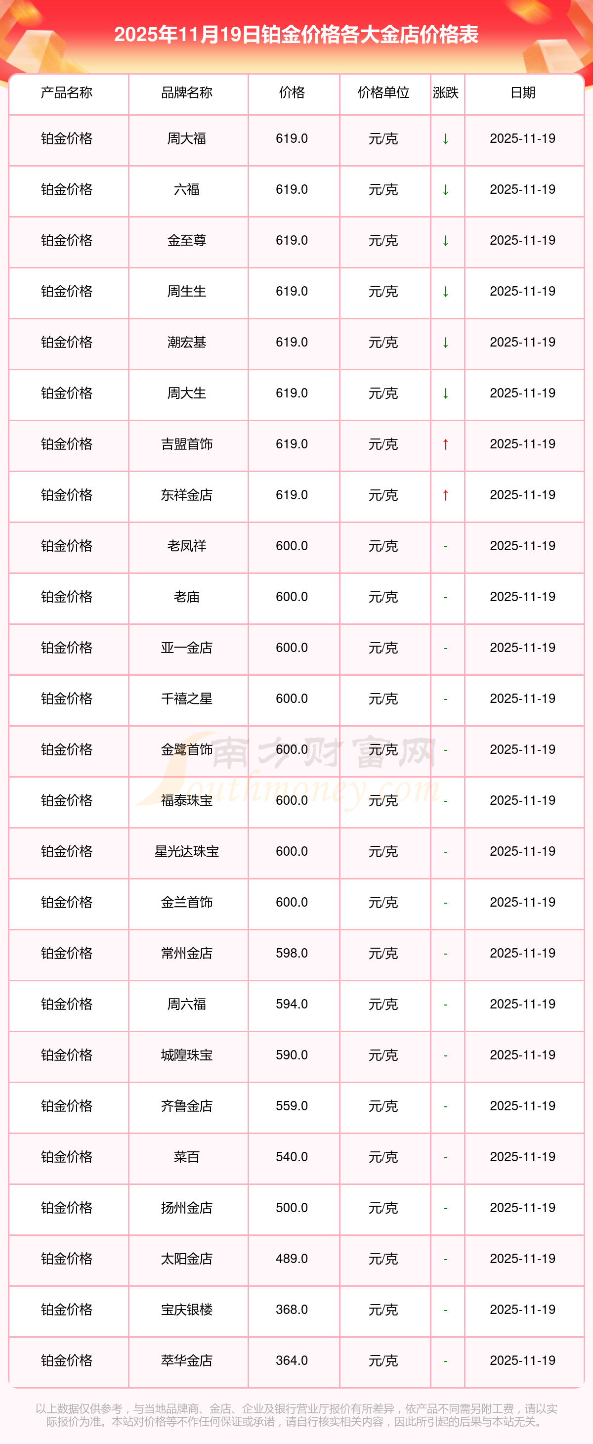 今天是2025年11月19日,周大福、周大福、周大福、周大福、周大福、周大福、周大福、老凤祥、老凤祥、老凤祥、周六福等各大金店品牌铂金价格最新价格如下:周大福1295.0元/克、周大福619.0元/克、周大福1295.0元/克、周大福45120.0、周大福17690.0、周大福40700.0、周大福1133.0元/克、老凤祥1291.0元/克、老凤祥600.0元/克、老凤祥1291.0元/克、周六福1263.0元/克。