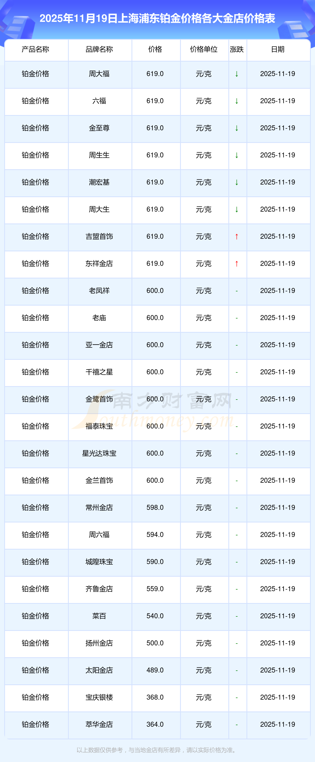 2025年11月19日,上海浦东周大福、周大福、周大福、周大福、周大福、周大福、周大福、老凤祥、老凤祥、老凤祥、周六福等各大金店品牌铂金价格今日价格行情最新来了:周大福1295.0元/克、周大福619.0元/克、周大福1295.0元/克、周大福45120.0、周大福17690.0、周大福40700.0、周大福1133.0元/克、老凤祥1291.0元/克、老凤祥600.0元/克、老凤祥1291.0元/克、周六福1263.0元/克。