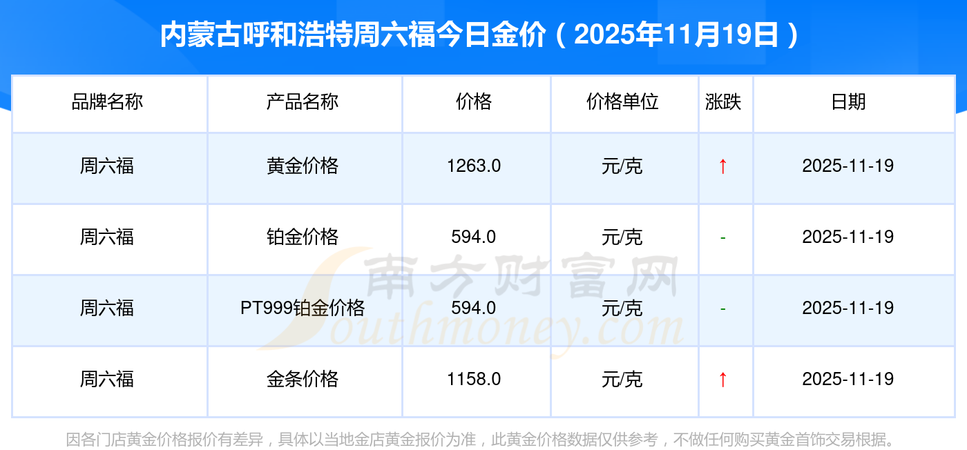2025年11月19日内蒙古呼和浩特周六福金价查询:黄金价格1295.0元/克,铂金价格619.0元/克,饰品金价(内地)1295.0元/克,黄金饰品(香港)45120.0,铂金价格(香港)17690.0,金条价格(香港)40700.0,金条金价(内地)1133.0元/克,黄金价格1291.0元/克,铂金价格600.0元/克,足金价格1291.0元/克,黄金价格1263.0元/克。