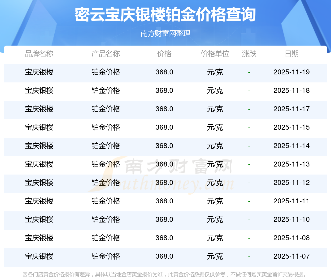 密云宝庆银楼铂金价格在 2025年11月19日为 368.0元/克。