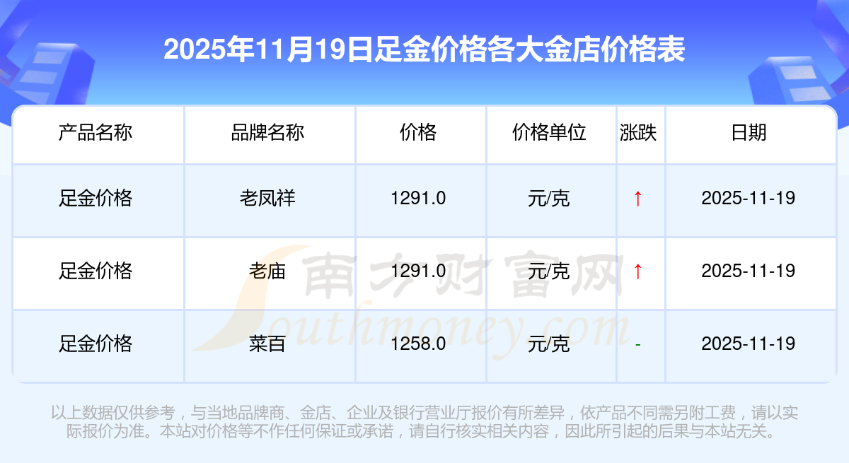 2025年11月19日,周大福、周大福、周大福、周大福、周大福、周大福、周大福、老凤祥、老凤祥、老凤祥、周六福等各大金店品牌足金价格今日价格如下:周大福1295.0元/克、周大福619.0元/克、周大福1295.0元/克、周大福45120.0、周大福17690.0、周大福40700.0、周大福1133.0元/克、老凤祥1291.0元/克、老凤祥600.0元/克、老凤祥1291.0元/克、周六福1263.0元/克。