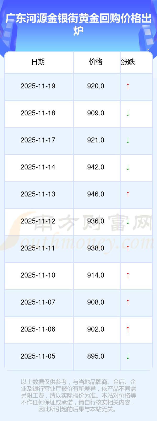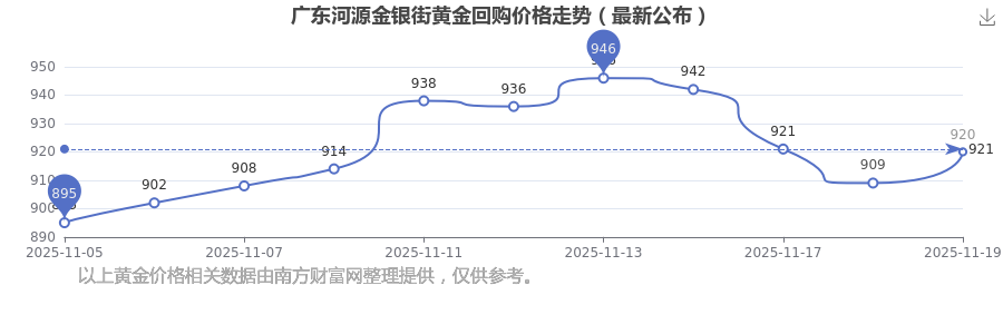 今日广东河源金银街黄金回购价格为920.0元/克。