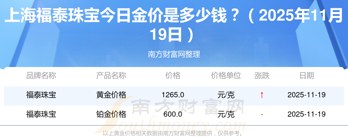 2025年11月19日上海福泰珠宝今日价格:黄金价格1295.0元/克,铂金价格619.0元/克,饰品金价(内地)1295.0元/克,黄金饰品(香港)45120.0,铂金价格(香港)17690.0,金条价格(香港)40700.0,金条金价(内地)1133.0元/克,黄金价格1291.0元/克,铂金价格600.0元/克,足金价格1291.0元/克,黄金价格1263.0元/克。