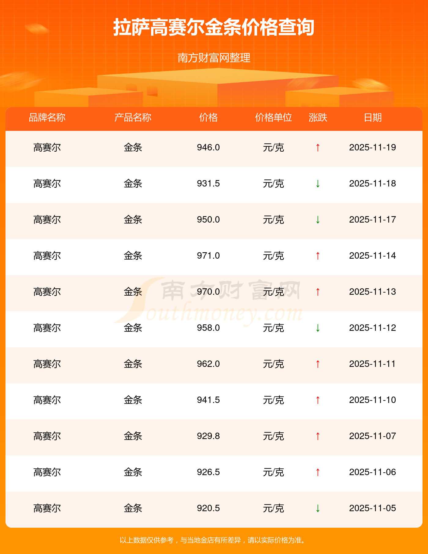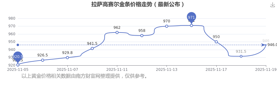 今日(2025年11月19日)拉萨高赛尔金条最新价格为946.0元/克。