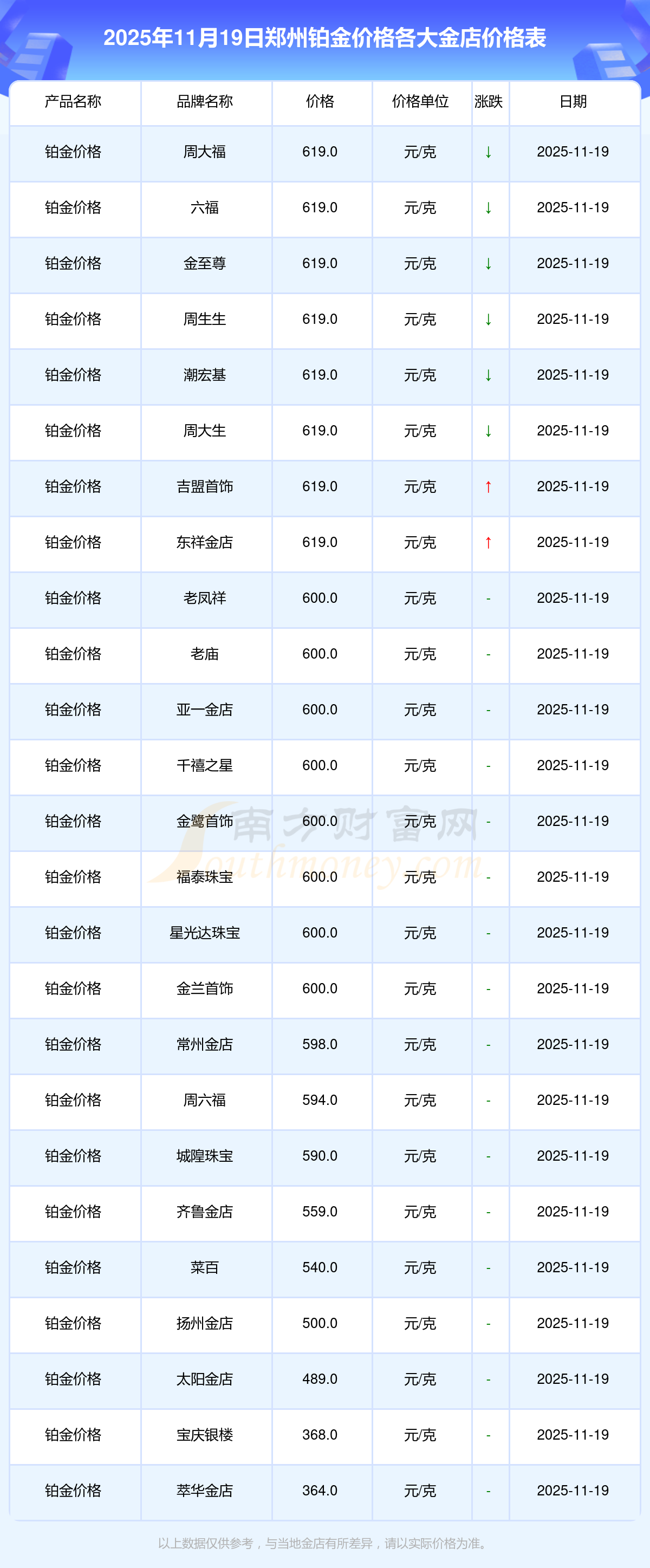 2025年11月19日郑州周大福、周大福、周大福、周大福、周大福、周大福、周大福、老凤祥、老凤祥、老凤祥、周六福等各大金店品牌铂金价格最新价格行情来了,如下:周大福黄金价格1295.0元/克,周大福铂金价格619.0元/克,周大福饰品金价(内地)1295.0元/克,周大福黄金饰品(香港)45120.0,周大福铂金价格(香港)17690.0,周大福金条价格(香港)40700.0,周大福金条金价(内地)1133.0元/克,老凤祥黄金价格1291.0元/克,老凤祥铂金价格600.0元/克,老凤祥足金价格1291.0元/克,周六福黄金价格1263.0元/克。