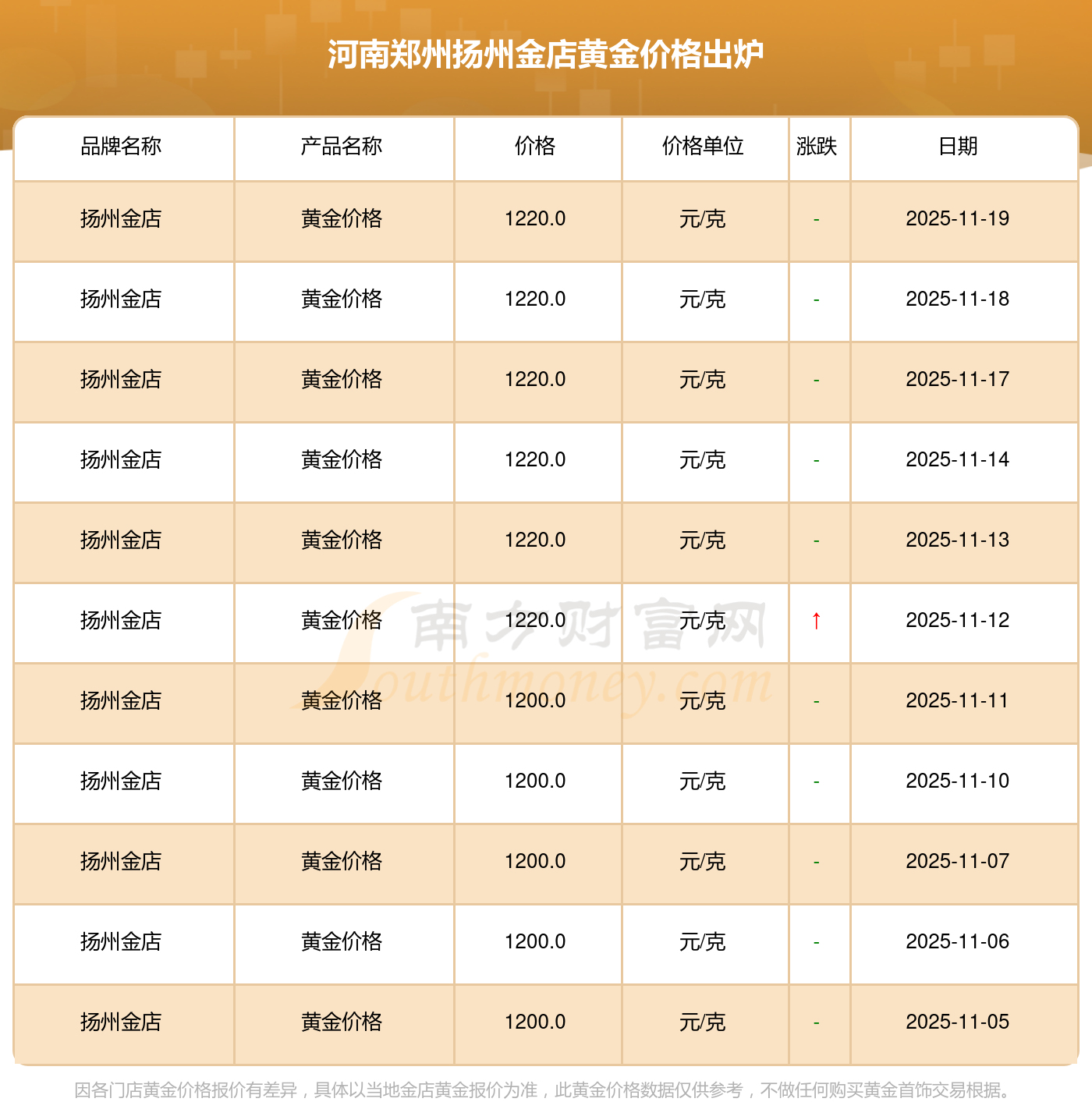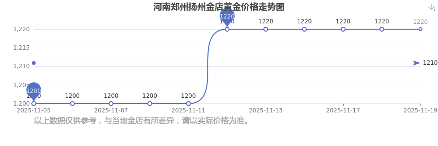 1220.0元/克,这是河南郑州扬州金店于 2025年11月19日所定的黄金价格。