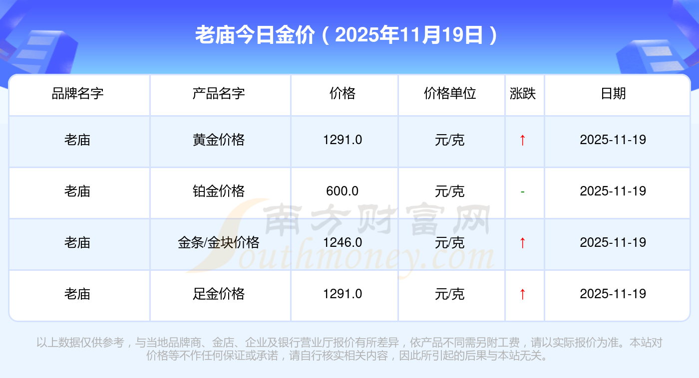 老庙黄金在今日的定价为多少?黄金价格1295.0元/克,铂金价格619.0元/克,饰品金价(内地)1295.0元/克,黄金饰品(香港)45120.0,铂金价格(香港)17690.0,金条价格(香港)40700.0,金条金价(内地)1133.0元/克,黄金价格1291.0元/克,铂金价格600.0元/克,足金价格1291.0元/克,黄金价格1263.0元/克。