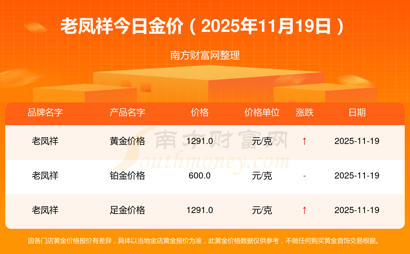 2025年11月19日各大金店铂金价格最新价格:周大福1295.0元/克,周大福619.0元/克,周大福1295.0元/克,周大福45120.0,周大福17690.0,周大福40700.0,周大福1133.0元/克,老凤祥1291.0元/克,老凤祥600.0元/克,老凤祥1291.0元/克,周六福1263.0元/克。