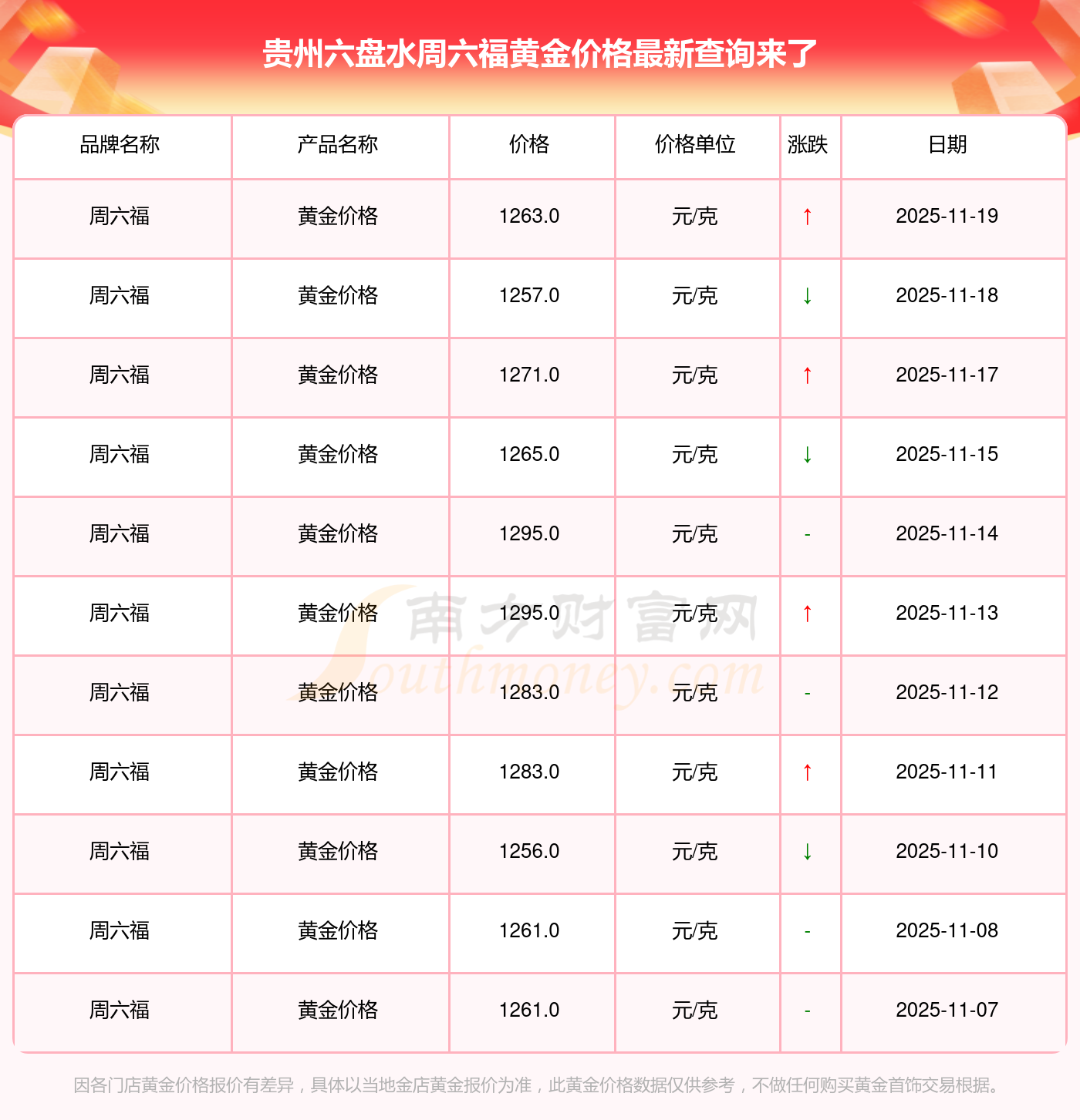 2025年11月19日各大金店黄金价格最新价格:周大福1295.0元/克,周大福619.0元/克,周大福1295.0元/克,周大福45120.0,周大福17690.0,周大福40700.0,周大福1133.0元/克,老凤祥1291.0元/克,老凤祥600.0元/克,老凤祥1291.0元/克,周六福1263.0元/克。