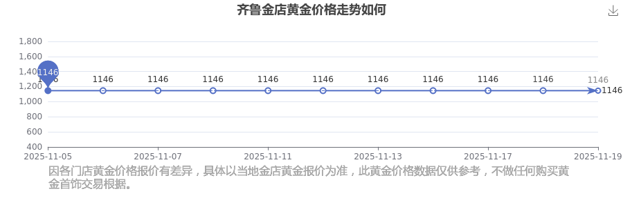 今日黄金价格查询_现在金价黄金一克多少钱,黄金价格是多少钱一克?黄金每克的价格通常在什么范围呢?今日齐鲁金店黄金价格:1146.0元/克。