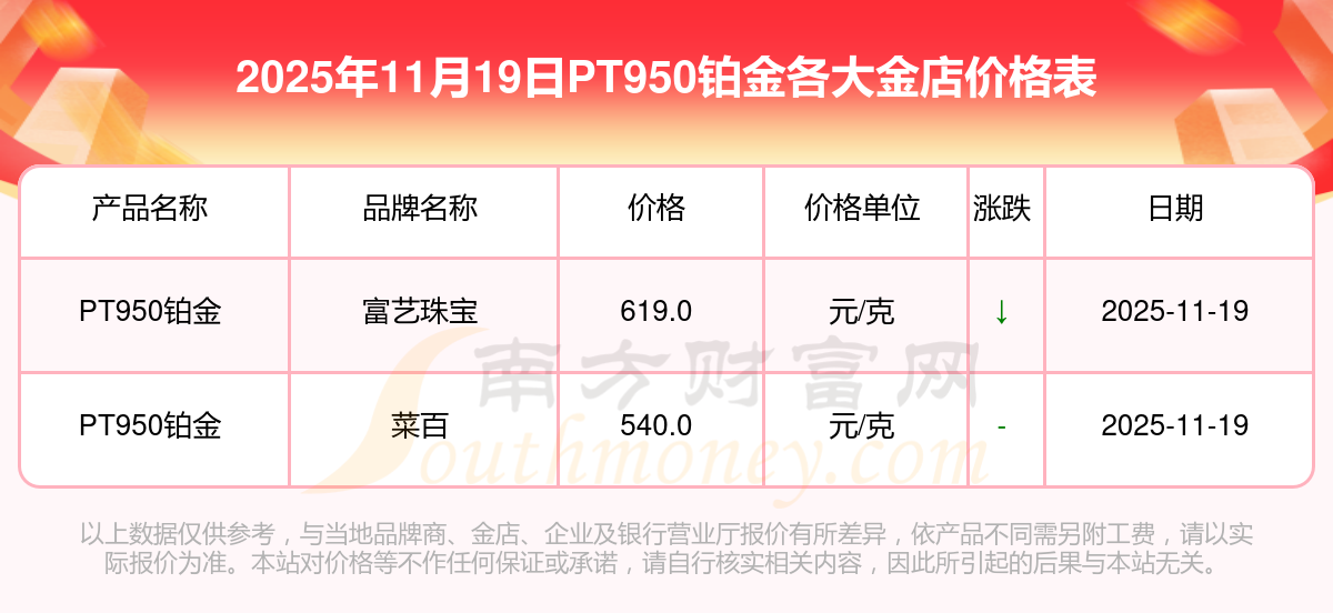 2025年11月19日各大金店PT950铂金最新价格:周大福1295.0元/克,周大福619.0元/克,周大福1295.0元/克,周大福45120.0,周大福17690.0,周大福40700.0,周大福1133.0元/克,老凤祥1291.0元/克,老凤祥600.0元/克,老凤祥1291.0元/克,周六福1263.0元/克。