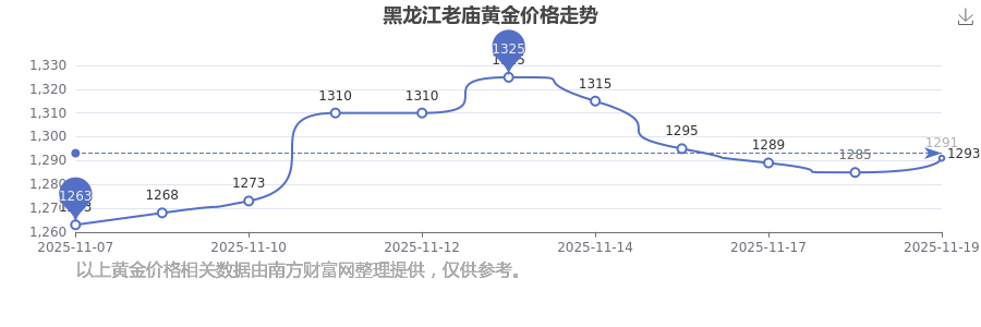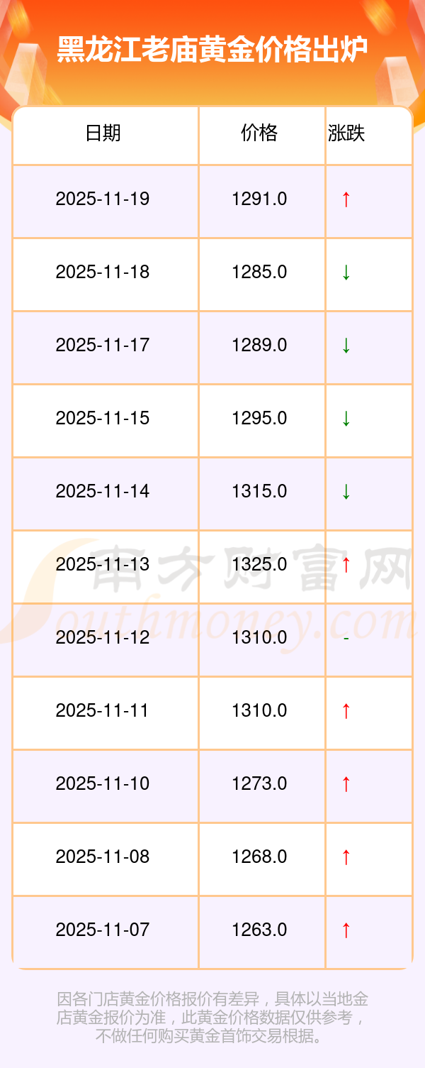 黑龙江老庙 2025年11月19日的黄金价格价位为 1291.0元/克。