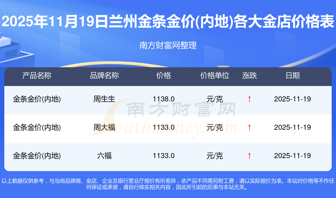 2025年11月19日兰州各大金店金条金价(内地)最新价格:周大福1295.0元/克,周大福619.0元/克,周大福1295.0元/克,周大福45120.0,周大福17690.0,周大福40700.0,周大福1133.0元/克,老凤祥1291.0元/克,老凤祥600.0元/克,老凤祥1291.0元/克,周六福1263.0元/克。