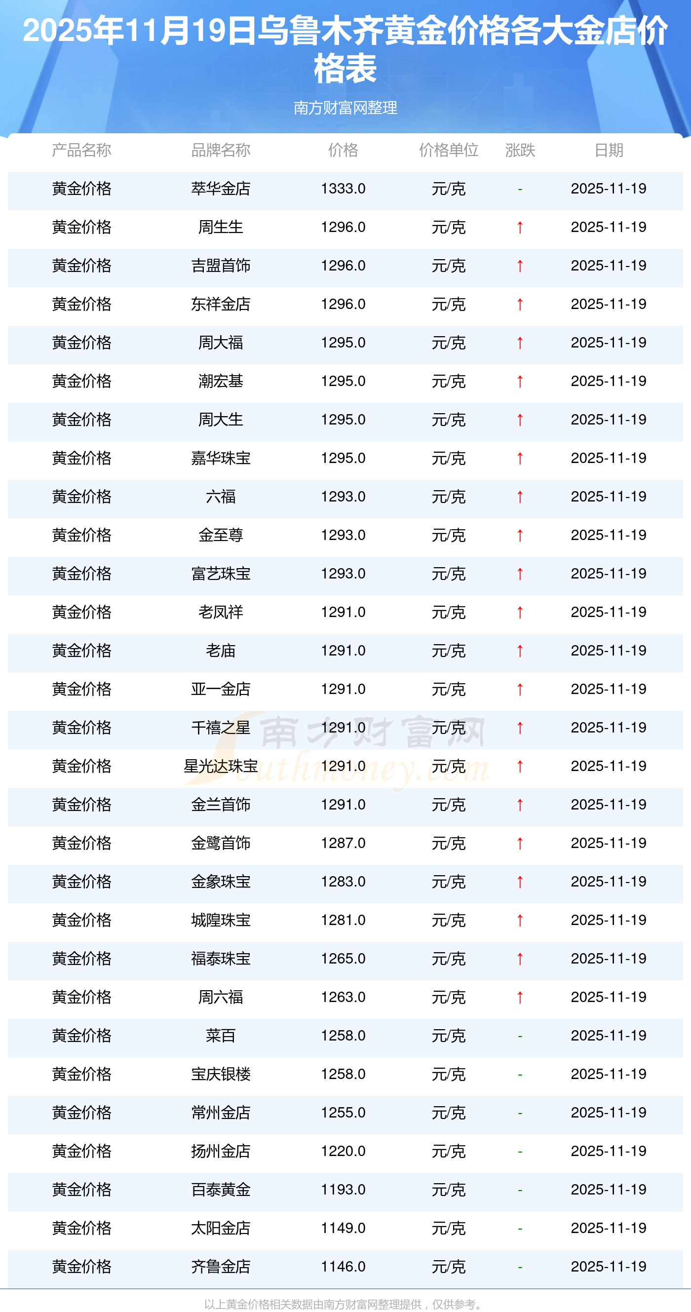 2025年11月19日乌鲁木齐周大福、周大福、周大福、周大福、周大福、周大福、周大福、老凤祥、老凤祥、老凤祥、周六福等各大金店品牌黄金价格最新价格如下:周大福黄金价格1295.0元/克,周大福铂金价格619.0元/克,周大福饰品金价(内地)1295.0元/克,周大福黄金饰品(香港)45120.0,周大福铂金价格(香港)17690.0,周大福金条价格(香港)40700.0,周大福金条金价(内地)1133.0元/克,老凤祥黄金价格1291.0元/克,老凤祥铂金价格600.0元/克,老凤祥足金价格1291.0元/克,周六福黄金价格1263.0元/克。