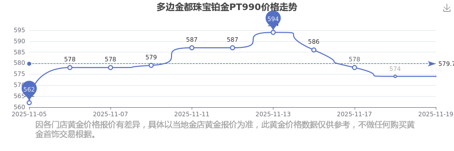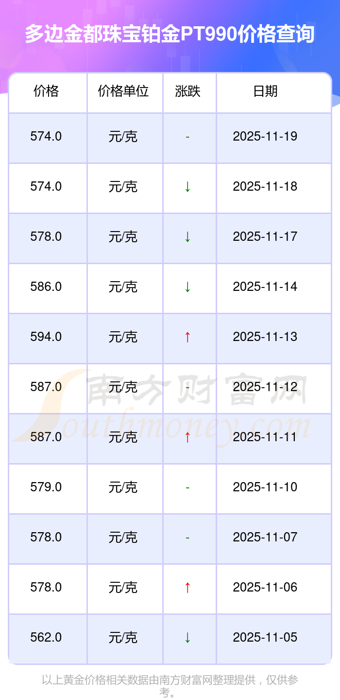 2025年11月19日多边金都珠宝铂金PT990价格查询:574.0元/克。