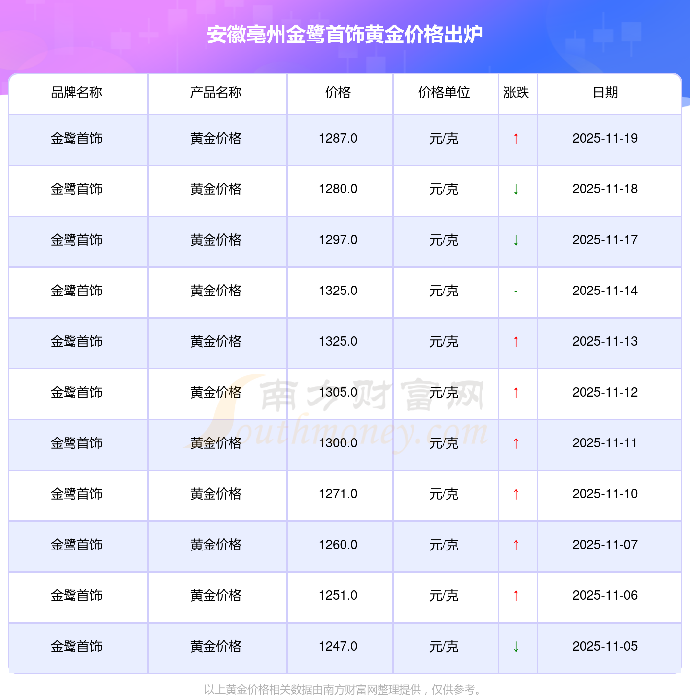 今日(2025年11月19日),安徽亳州金鹭首饰黄金价格:1287.0元/克。