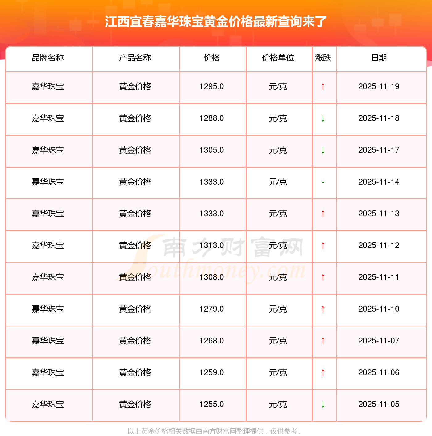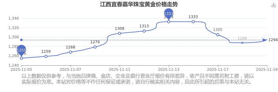 2025年11月19日,江西宜春嘉华珠宝所售黄金价格,其价格设定为 1295.0元/克。