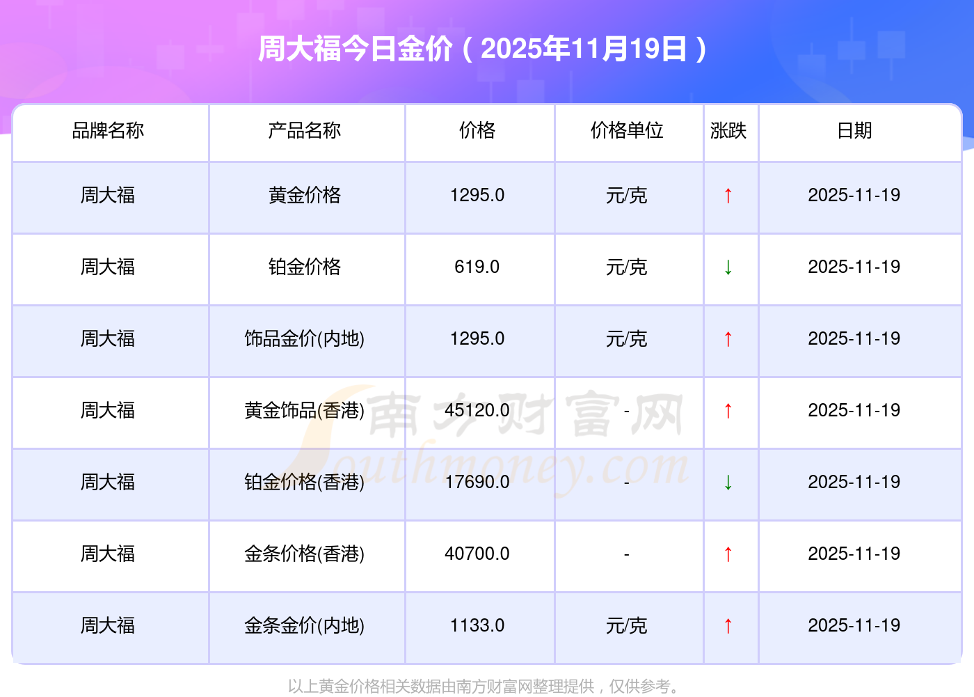 黄金价格1295.0元/克,铂金价格619.0元/克,饰品金价(内地)1295.0元/克,黄金饰品(香港)45120.0,铂金价格(香港)17690.0,金条价格(香港)40700.0,金条金价(内地)1133.0元/克,黄金价格1291.0元/克,铂金价格600.0元/克,足金价格1291.0元/克,黄金价格1263.0元/克。