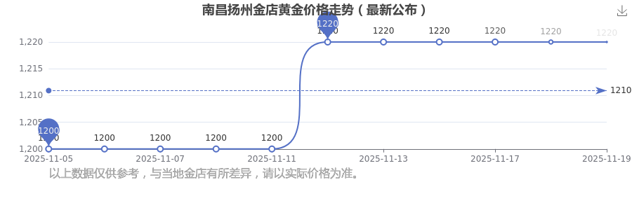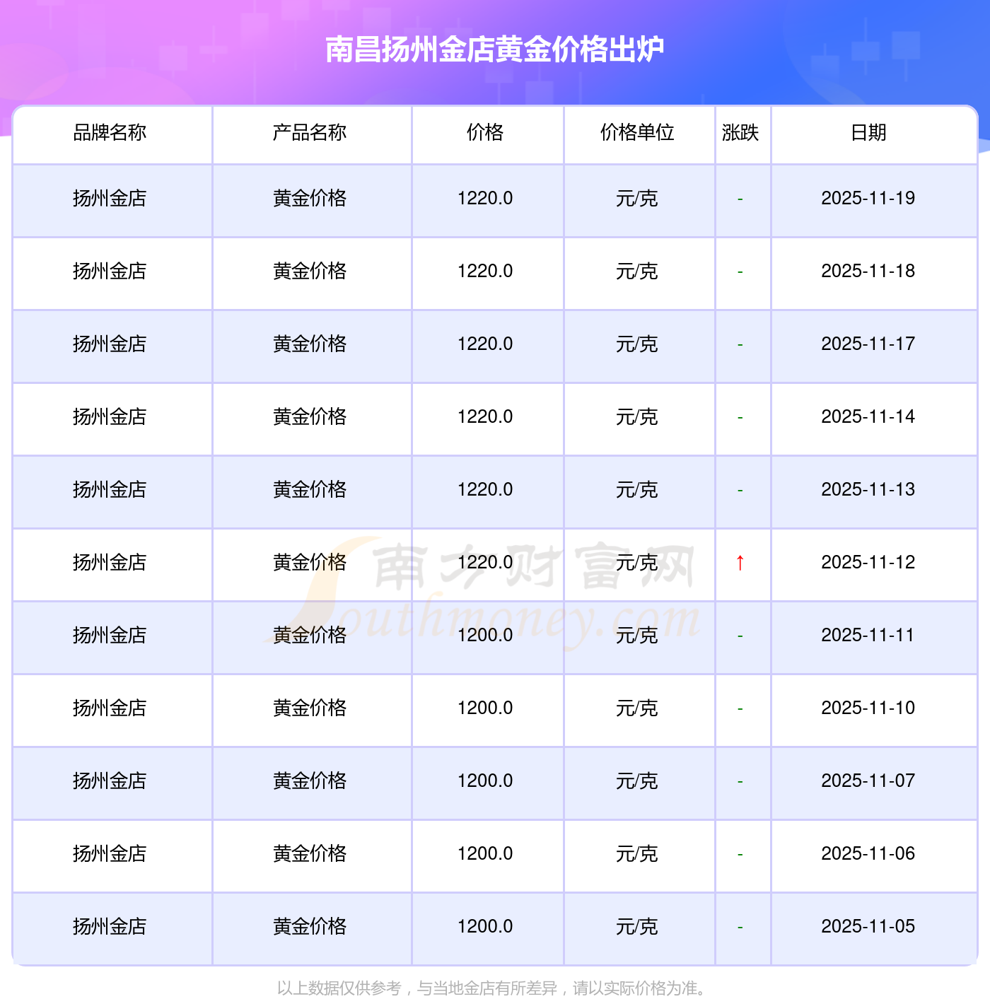 (2025年11月19日)今日南昌扬州金店黄金价格是1220.0元/克。
