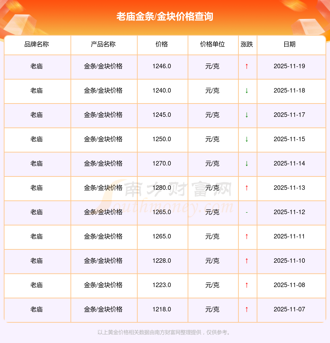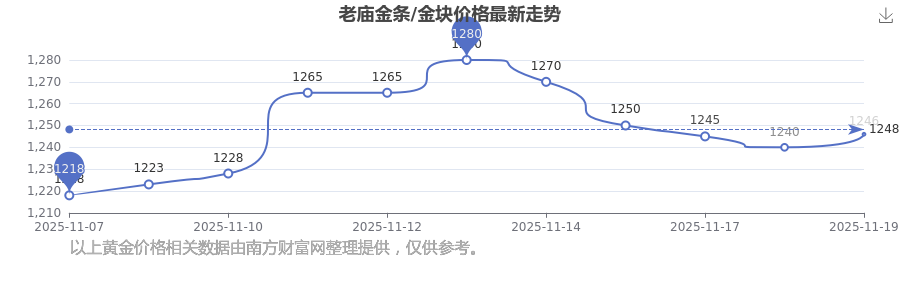 今日(2025年11月19日),老庙金条/金块价格最新价格为1246.0元/克。