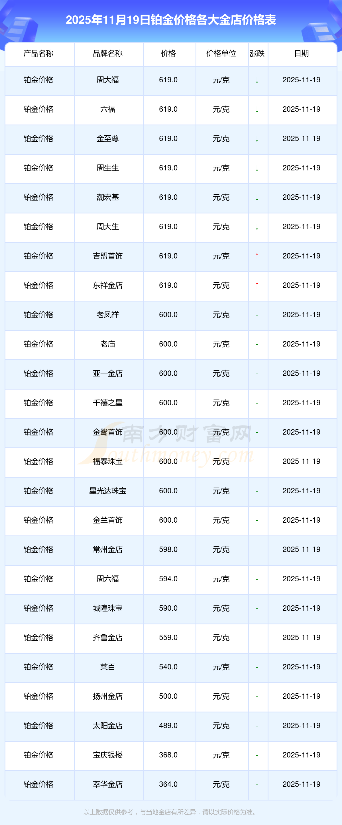 2025年11月19日各大金店铂金价格最新价格:周大福1295.0元/克,周大福619.0元/克,周大福1295.0元/克,周大福45120.0,周大福17690.0,周大福40700.0,周大福1133.0元/克,老凤祥1291.0元/克,老凤祥600.0元/克,老凤祥1291.0元/克,周六福1263.0元/克。