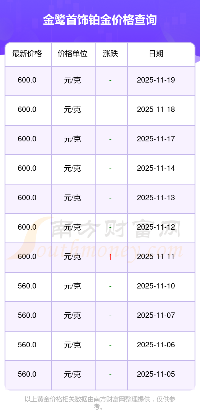 600.0元/克成为金鹭首饰今日 铂金价格的最新交易的价格。
