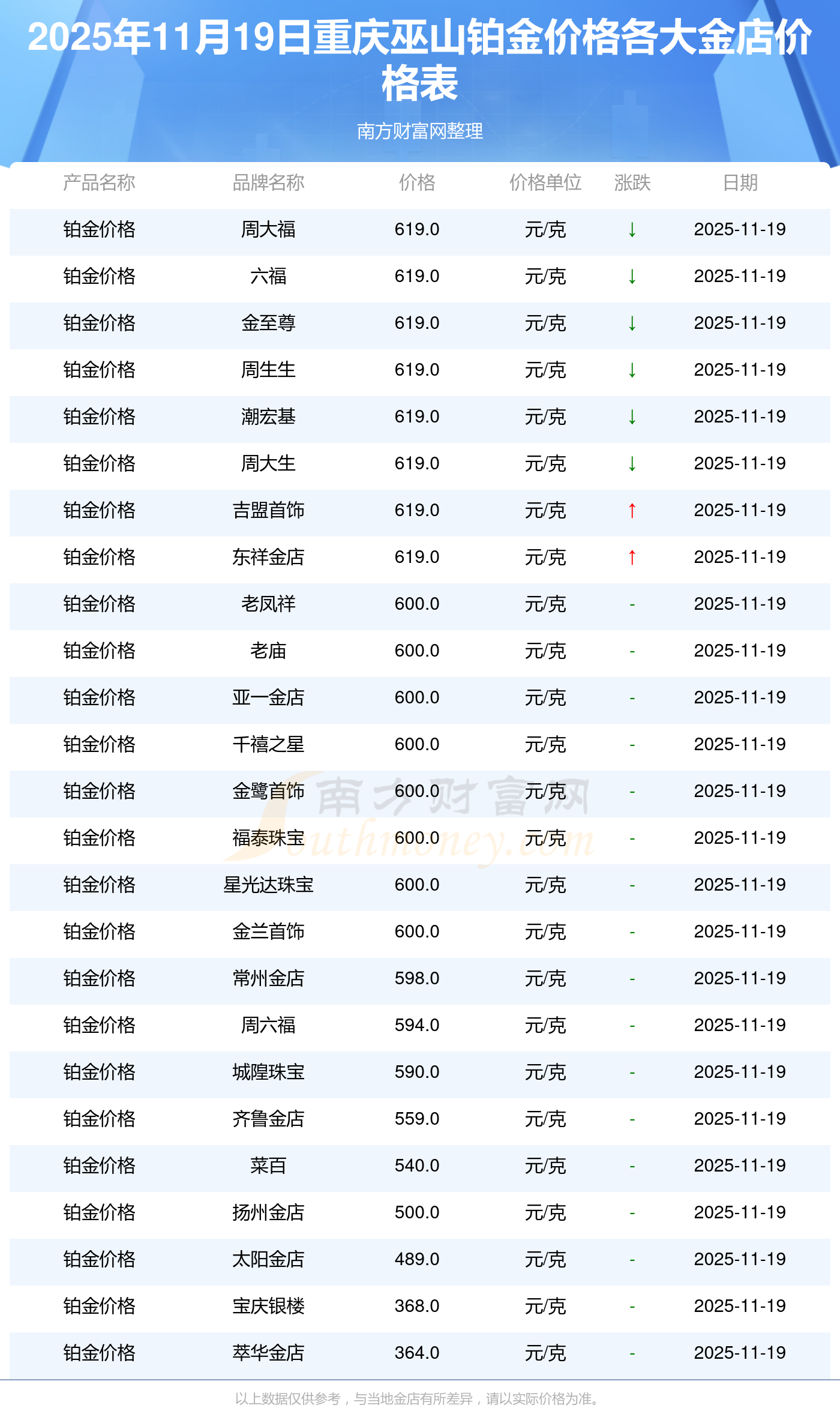 2025年11月19日重庆巫山周大福、周大福、周大福、周大福、周大福、周大福、周大福、老凤祥、老凤祥、老凤祥、周六福等各大金店品牌铂金价格最新价格行情来了,如下:周大福黄金价格1295.0元/克,周大福铂金价格619.0元/克,周大福饰品金价(内地)1295.0元/克,周大福黄金饰品(香港)45120.0,周大福铂金价格(香港)17690.0,周大福金条价格(香港)40700.0,周大福金条金价(内地)1133.0元/克,老凤祥黄金价格1291.0元/克,老凤祥铂金价格600.0元/克,老凤祥足金价格1291.0元/克,周六福黄金价格1263.0元/克。