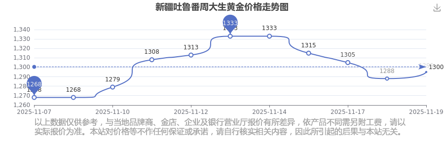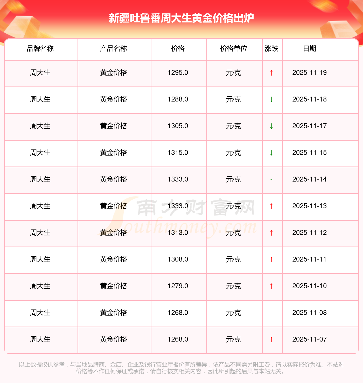 2025年11月19日新疆吐鲁番周大生黄金价格:1295.0元/克。