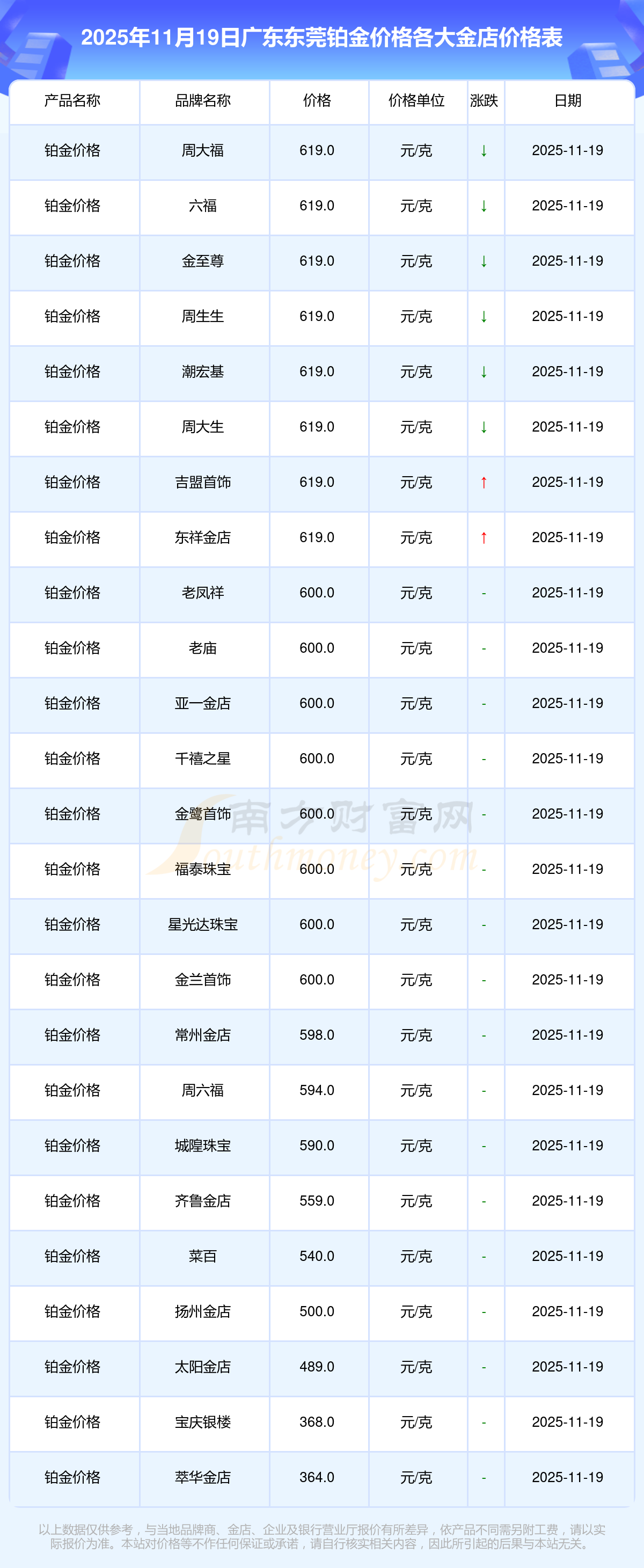 2025年11月19日广东东莞周大福、周大福、周大福、周大福、周大福、周大福、周大福、老凤祥、老凤祥、老凤祥、周六福等各大金店品牌铂金价格最新价格如下:周大福黄金价格1295.0元/克,周大福铂金价格619.0元/克,周大福饰品金价(内地)1295.0元/克,周大福黄金饰品(香港)45120.0,周大福铂金价格(香港)17690.0,周大福金条价格(香港)40700.0,周大福金条金价(内地)1133.0元/克,老凤祥黄金价格1291.0元/克,老凤祥铂金价格600.0元/克,老凤祥足金价格1291.0元/克,周六福黄金价格1263.0元/克。