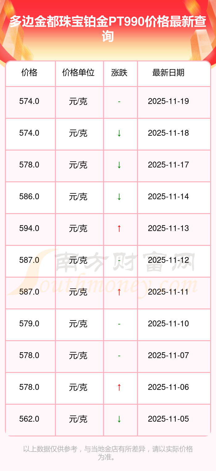 今日(2025年11月19日)多边金都珠宝铂金PT990价格为574.0元/克。