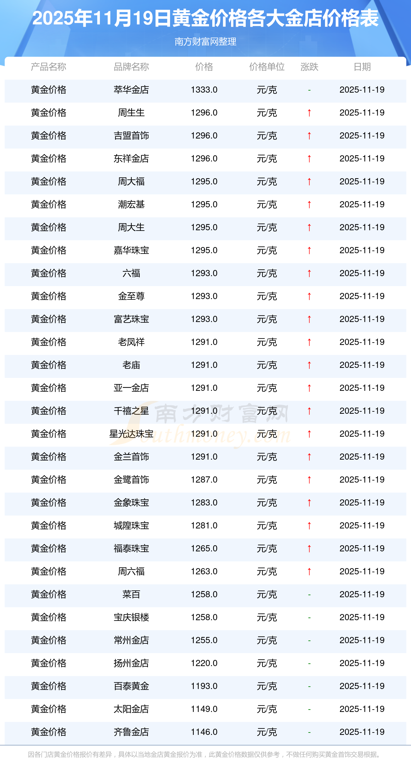 2025年11月19日,周大福、周大福、周大福、周大福、周大福、周大福、周大福、老凤祥、老凤祥、老凤祥、周六福等各大金店品牌黄金价格今日价格如下:周大福1295.0元/克、周大福619.0元/克、周大福1295.0元/克、周大福45120.0、周大福17690.0、周大福40700.0、周大福1133.0元/克、老凤祥1291.0元/克、老凤祥600.0元/克、老凤祥1291.0元/克、周六福1263.0元/克。
