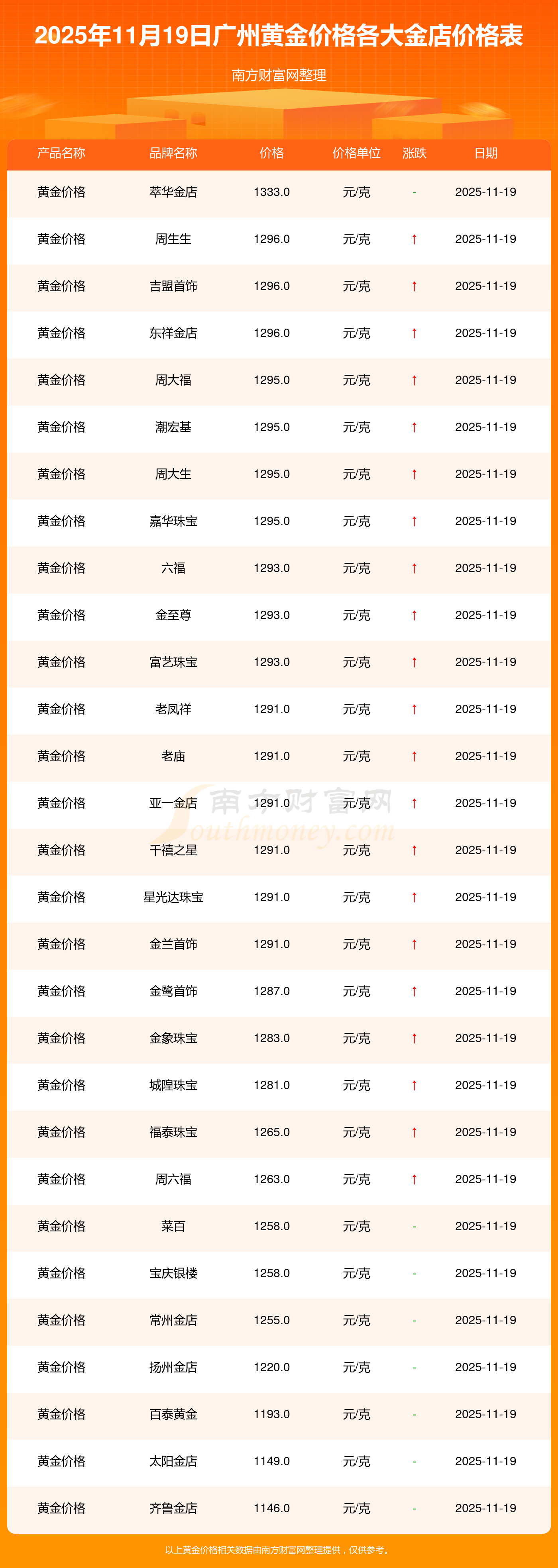 2025年11月19日广州各大金店黄金价格最新价格查询来了:周大福1295.0元/克,周大福619.0元/克,周大福1295.0元/克,周大福45120.0,周大福17690.0,周大福40700.0,周大福1133.0元/克,老凤祥1291.0元/克,老凤祥600.0元/克,老凤祥1291.0元/克,周六福1263.0元/克。