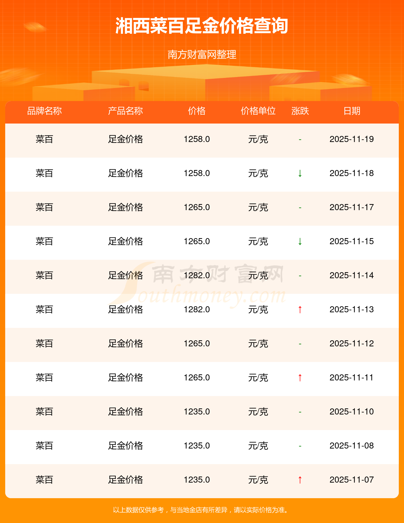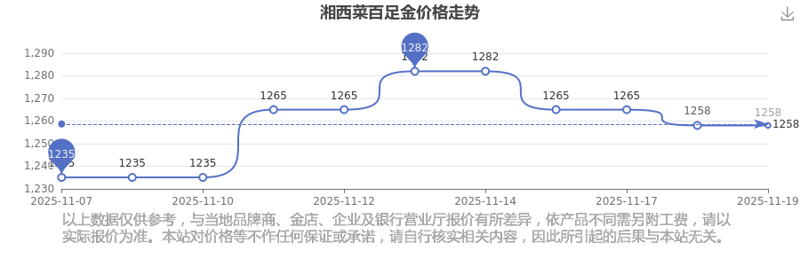 湘西菜百在 2025年11月19日的足金价格零售价格为 1258.0元/克。
