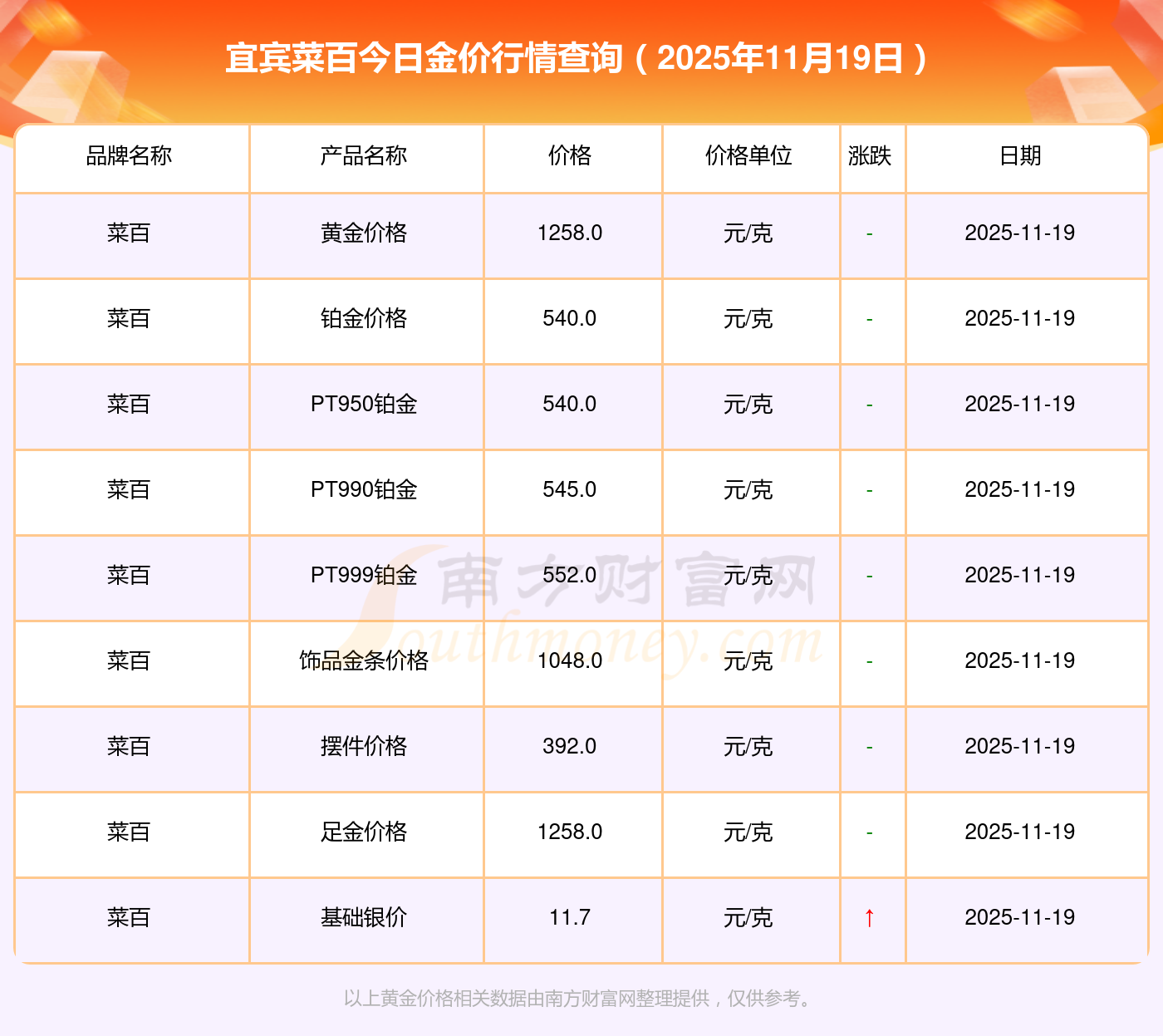 2025年11月19日宜宾菜百现在购买一克黄金需要支付多少钱?黄金价格1295.0元/克,铂金价格619.0元/克,饰品金价(内地)1295.0元/克,黄金饰品(香港)45120.0,铂金价格(香港)17690.0,金条价格(香港)40700.0,金条金价(内地)1133.0元/克,黄金价格1291.0元/克,铂金价格600.0元/克,足金价格1291.0元/克,黄金价格1263.0元/克。