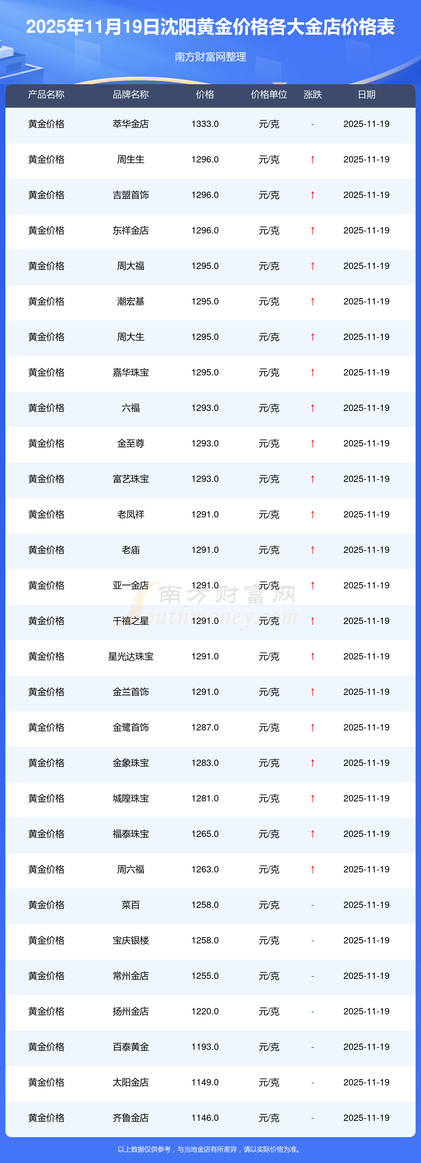 今天是2025年11月19日,沈阳周大福、周大福、周大福、周大福、周大福、周大福、周大福、老凤祥、老凤祥、老凤祥、周六福等各大金店品牌黄金价格最新价格行情是这样的:周大福1295.0元/克、周大福619.0元/克、周大福1295.0元/克、周大福45120.0、周大福17690.0、周大福40700.0、周大福1133.0元/克、老凤祥1291.0元/克、老凤祥600.0元/克、老凤祥1291.0元/克、周六福1263.0元/克。